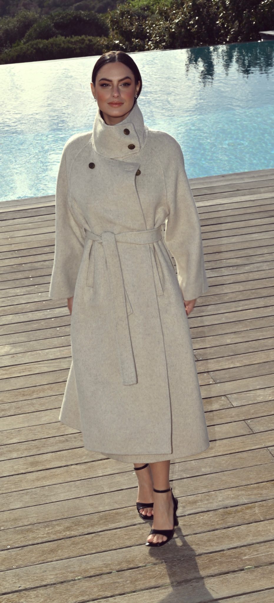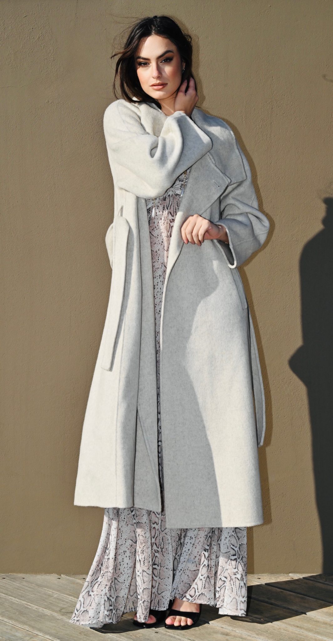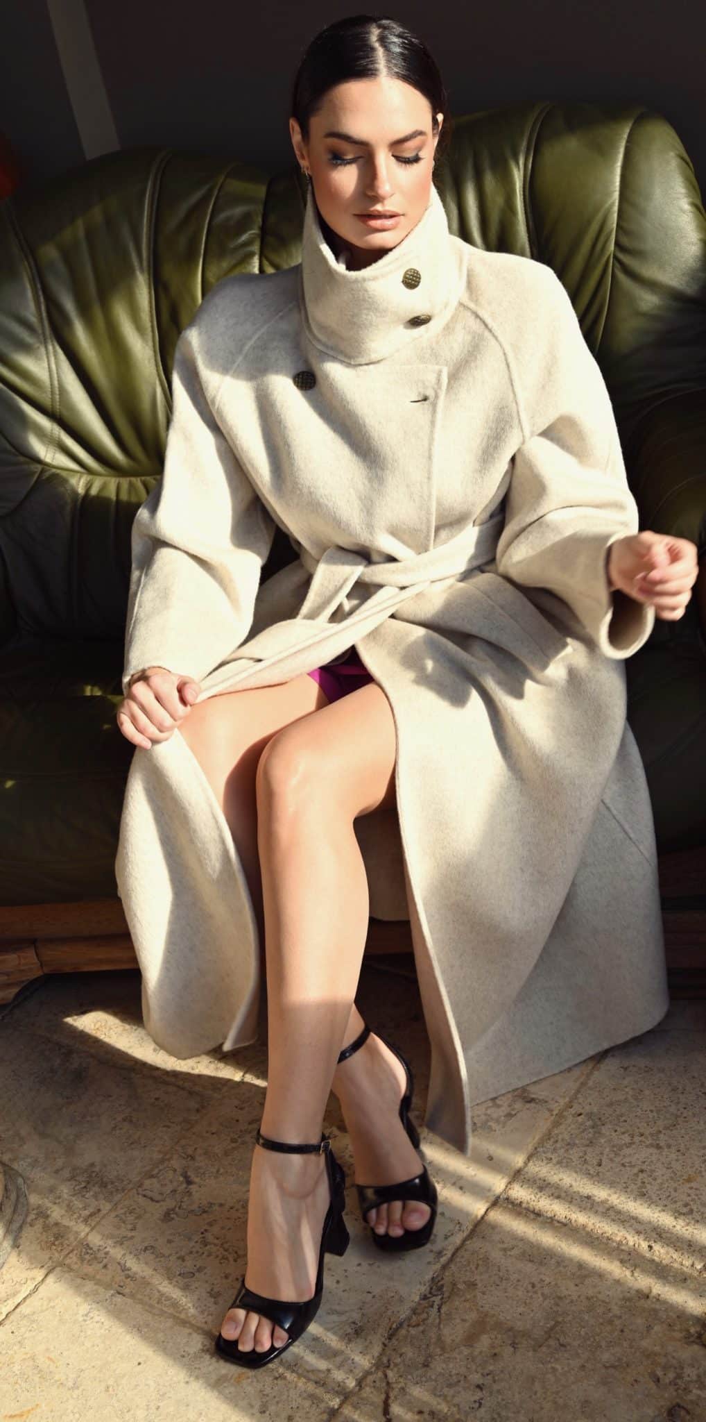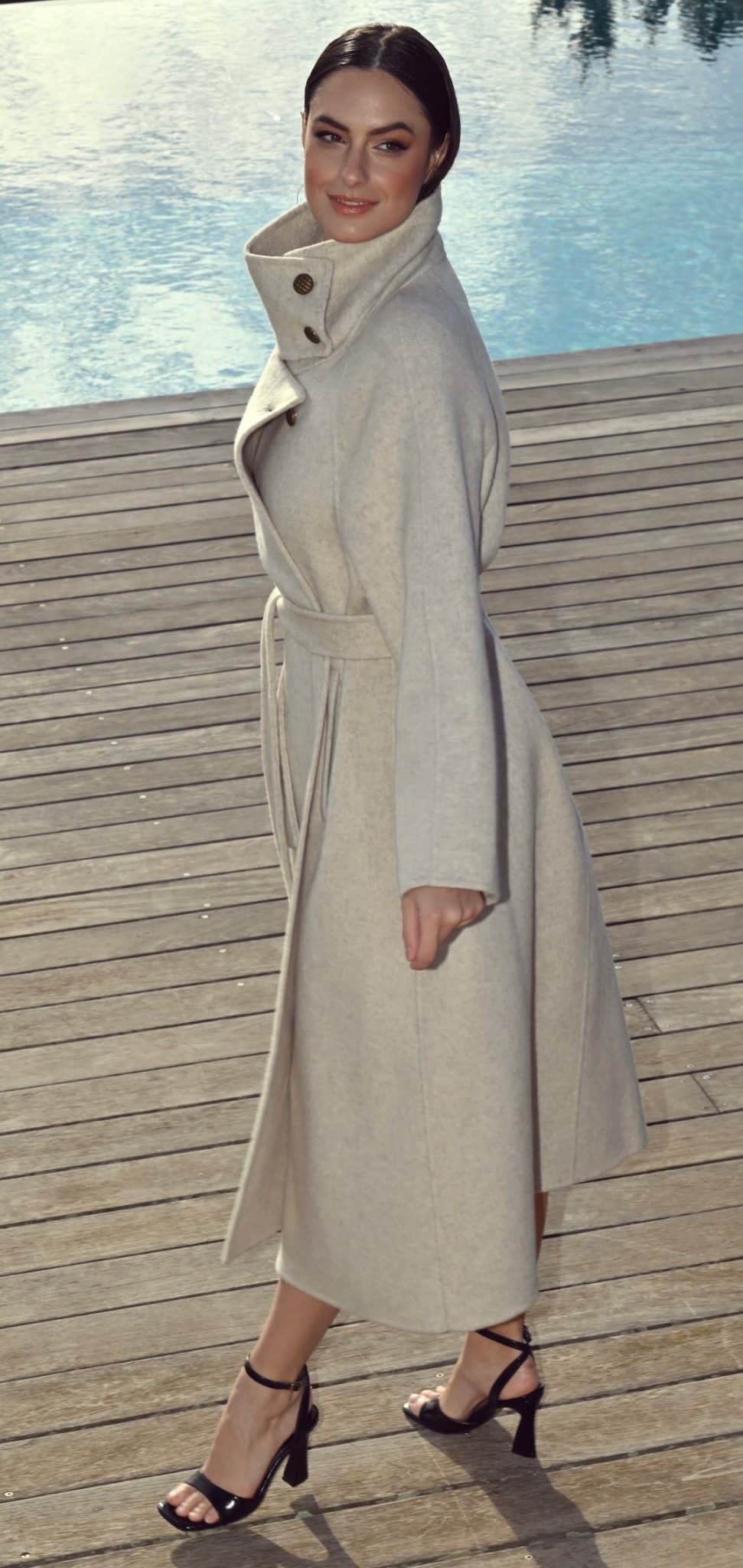 Ce manteau long pour femme en laine couleur avoine allie chaleur, confort et sophistication.