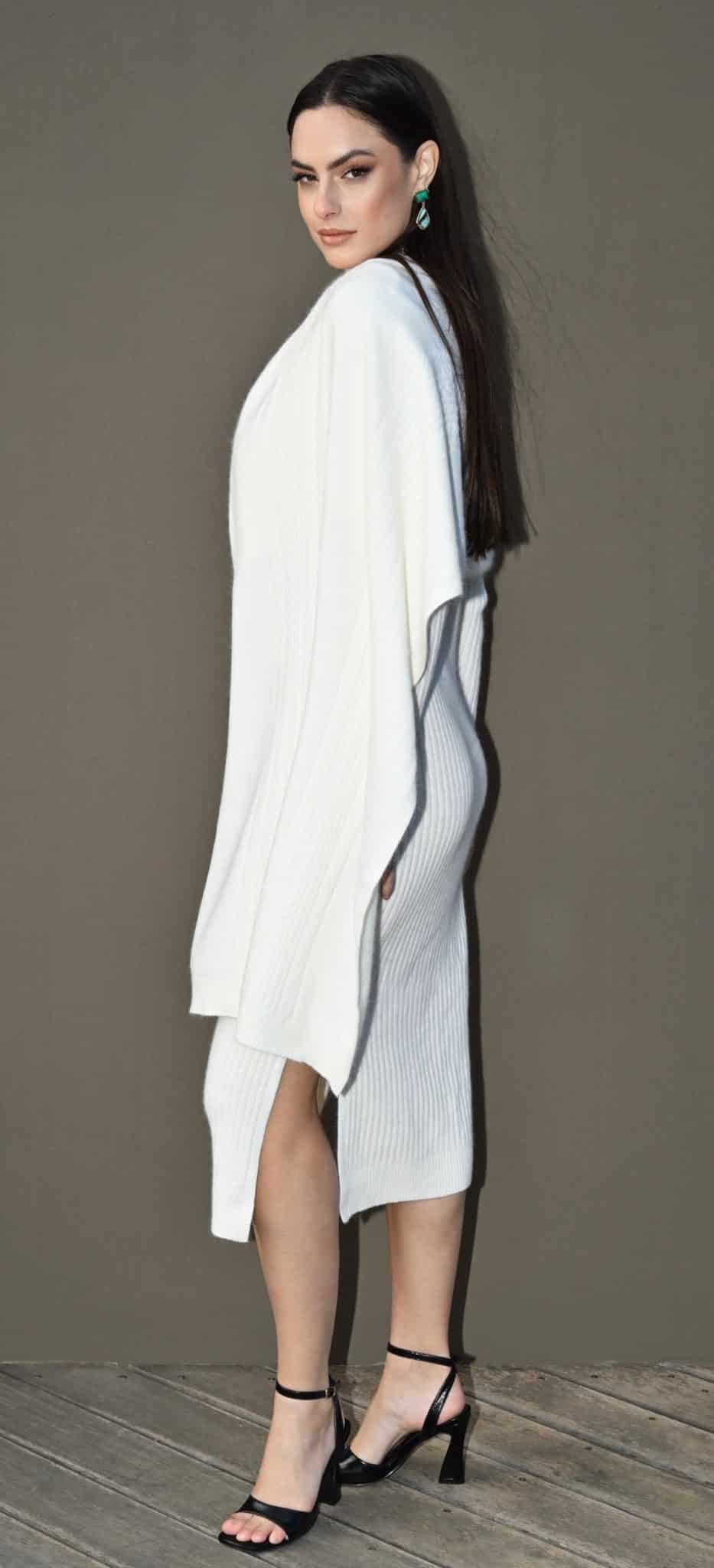 Sa maille côtelé sculptante, associée à une coupe ajustée et une fente subtile sur la cuisse, crée un équilibre parfait entre chaleur, féminité et sophistication. Le col rond et les manches longues apportent une allure naturellement la silhouette. Dans sa teinte ivoire, cette robe incarne la douceur des tons naturels et s’adapte à toutes les occasions : une journée élégante, un dîner raffiné ou une soirée où l’on souhaite se sentir à l’aise.